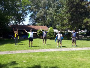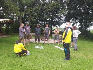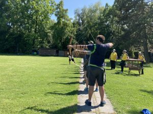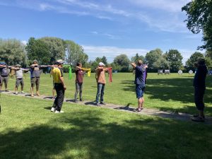 Nach der Bogen und Scheibenkunde geht’s wieder auf den Platz und wir bewerfen uns fröhlich mit Bällen und Frisbees, um uns die Teilnehmernamen zu merken. Erfolg: Ungewiss. Verluste: 1 Frisbee und 1 Ball.