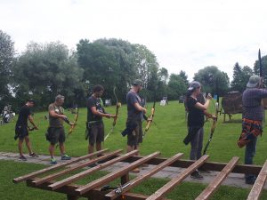 Dann geht’s wieder zum Schießen. Bogen Aufspannen, Sicherheitsequipment anlegen, an die Schießlinie und es geht los mit 6er Passen.