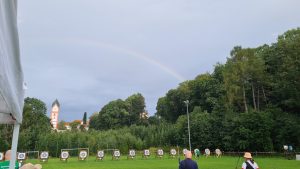 Vor Beginn gab es einen großen Regenschauer mit leichtem Wolkengrummeln, zum Start war davon nichts mehr zu merken und während des 1. Durchgangs zeigte sich ein großer Regenbogen übern Platz – und der ein oder andere Schütze war versucht zum Ende des Regenbogens zu gelangen um sich den Topf voll Gold zu sichern….. 😊