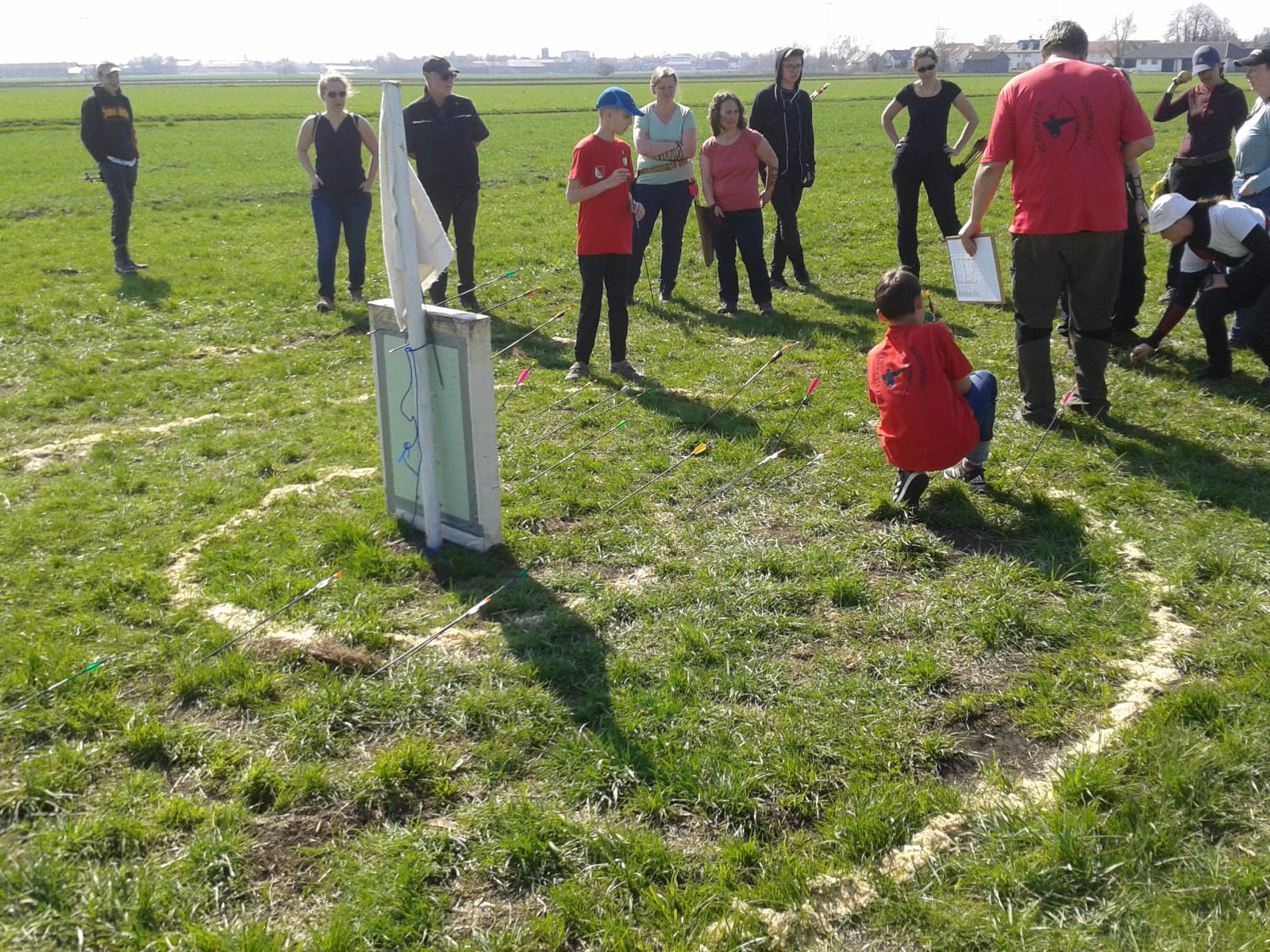 Begrüßt wurden die Schützen von strahlendem Sonnenschein und einem kleinen Geschichtskurs. Clout Turniere waren eine beliebte Wettkampfart im Mittelalter und der Name kommt nicht daher, dass man in die Wolken (cloud) zielt um zu treffen, sondern man versucht einen Lappen (clout) mit seinen Pfeilen zu durchlöchern. In Puchheim galt es jedoch anstatt der mittelalterlichen Lappen, Styroporplatten zu treffen. Diese waren in den jeweiligen Entfernungen senkrecht an einem Stab befestigt. Rund herum um diese Platten gab es auf dem Boden Kreise mit den Wertigkeiten 5 Ringe, 3 Ringe und 1 Ring.